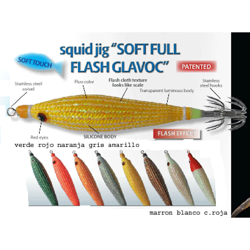 8 colores Cuerpo de silicona Anzuelos inox Colores fluor Cuerpo fluorescente Ojos rojos fluor Numero 2,5 y longitud 70mm